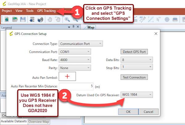 GPS Setup on GeoMap If your GPS is set to WGS84, it will likely be more accurate on the new GDA2020 maps, as GDA2020 is designed to align with modern WGS84. Key Advice: If you are working with mining tenement boundaries in WA, ensure your mapping software (e.g., QGIS) or GIS services are configured to use GDA2020 to avoid a roughly 2-meter, north-east error compared to the new Tengraph data. Using Your Android Phone Default System: Android Location APIs, which feed location data to Google Maps and other apps, are based on WGS84. Accuracy: While WGS84 is the standard, actual accuracy depends on the GPS receiver chip in your phone, which may also utilize GLONASS or Galileo for better precision. Forcing High Accuracy: To ensure your phone is providing the best possible location data, you should enable "High accuracy" mode. Go to Settings > Location > Location Services. Enable Google Location Accuracy. Coordinate Format: If you need to enter specific WGS84 coordinates into a mapping app (like for geocaching), you can do so in Latitude/Longitude format within apps like Google Maps. How to Use WGS84 on iPhone: Apple Compass App: The built-in Compass app provides coordinates (latitude/longitude) based on the WGS84 datum. Third-Party Apps: Many GPS-specific apps (e.g., Gaia GPS, Handy GPS, My GPS Coordinates) allow you to explicitly select WGS84 as the datum, along with formats like UTM or Degrees/Minutes/Seconds. Apple Maps: The coordinates used in Apple Maps are based on the WGS84 system. " Note from Bill - GeoMap is not used on Phones in the field anyway but on your PC so you would set the GPS to its default in GeoMap which is WGS84 if it doesn't have GDA2020. Datum Setting Geomap vs 1.10.1.0